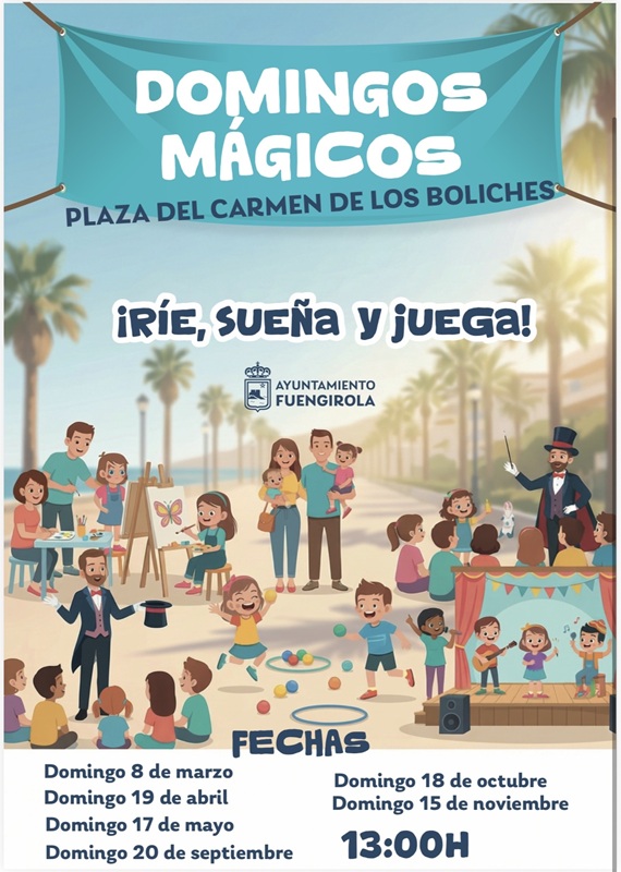 6/3/2026 – El Ayuntamiento de Fuengirola pondrá en marcha una nueva propuesta de ocio familiar en el barrio de Los Boliches bajo el nombre de ‘Domingos Mágicos’, un ciclo mensual de espectáculos gratuitos que se celebrará en la plaza del Carmen con el objetivo de dinamizar la actividad vecinal y fomentar la convivencia. La primera cita será este próximo domingo, 8 de marzo, a partir de las 13:00 horas.