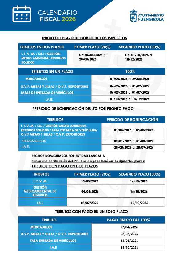11/3/2026 – El Ayuntamiento de Fuengirola ha informado del periodo voluntario de pago de impuestos, que se extiende desde el 1 de abril hasta el día 5 de mayo y que supone un 5% de descuento por pronto pago en los tributos de IBI, IVTM y GEMER. El abono de los mismos se puede hacer de manera telemática por medio de la Sede Electrónica de la página web municipal, por Paybol o de forma presencial en el departamento de Recaudación del Ayuntamiento, así como a través de los cajeros ciudadanos instalados en las tenencias de alcaldía de Los Boliches y El Boquetillo y también en el propio Consistorio y en las oficinas de Correos.