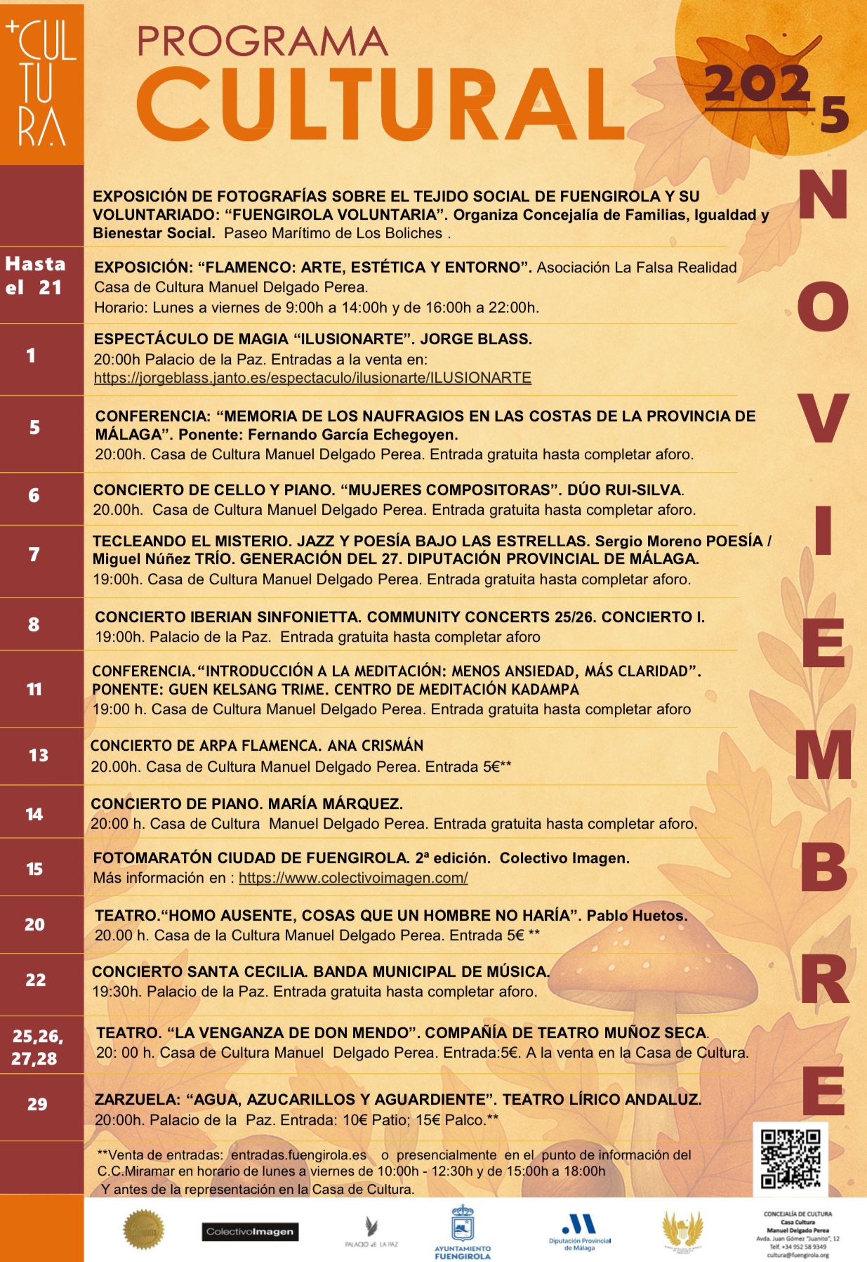 30/10/2025 – El Ayuntamiento de Fuengirola ha programado para el mes de noviembre una extensa programación cultural que incluye un total de quince actividades para todos los públicos. Así  lo ha dado a conocer hoy el edil del área, Rodrigo Romero, quien ha destacado la variedad de las propuestas, que van desde conciertos y conferencias a exposiciones y obras de teatro.