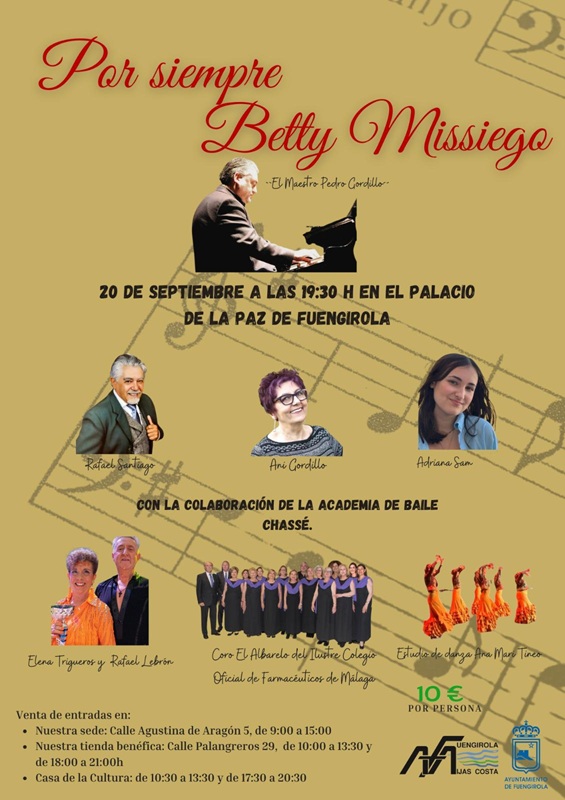 Por su parte, Pedro Gordillo ha señalado que “nuestra intención es hacer un homenaje cariñoso y cercano a Betty Missiego, que hemos preparado con mucha ilusión. Hemos seleccionado sus canciones más emblemáticas, que serán interpretadas por el Coro El Albarelo, del Ilustre Colegio de Farmacéuticos de Málaga, así como por los artistas invitados”, ha explicado Gordillo, quien ha animado a asistir al espectáculo, “porque va a merecer mucho la pena. Vamos a pasar una tarde noche muy agradabl,e con canciones que nos van a transportar a momentos de la vida de cada uno de nosotros, para compartir este deleite musical como homenaje a Betty Missiego”.