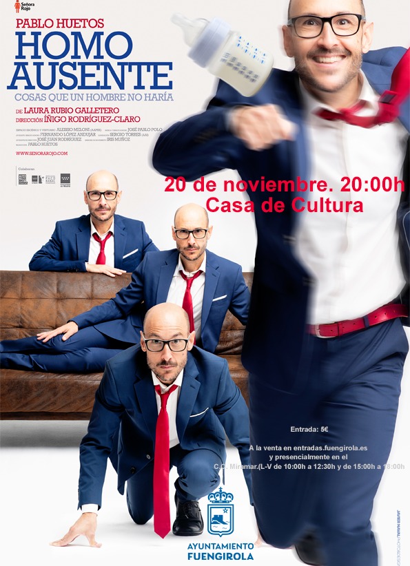 12/11/2025 – El teatro regresará a la Casa de la Cultura Manuel Delgado Perea de Fuengirola el próximo 20 de noviembre con la obra ‘Homo ausente. Cosas que un hombre no haría’. Así lo ha dado a conocer hoy el concejal de Cultura, Rodrigo Romero, quien ha señalado que la representación comenzará a las 20:00 horas y las entradas, que tienen un precio de 5 euros, se pueden adquirir a través de la web https://entradas.fuengirola.es o presencialmente en el punto de información del Centro Comercial Miramar, de lunes a viernes, en horario de 10:00 a 12:30 y de 15:00 a 18:00 horas, y antes de la representación, en la Casa de Cultura.