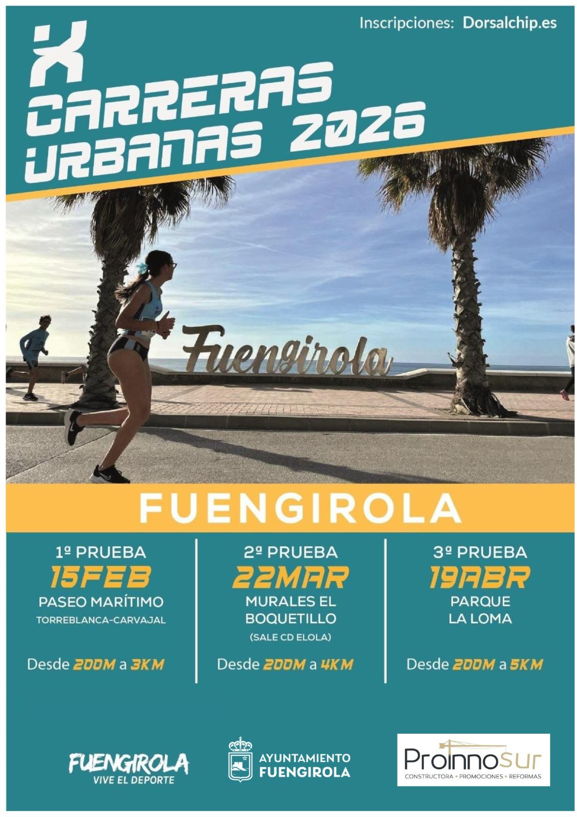 16/1/2026 – El X Circuito de Carreras Urbanas 2026 de Fuengirola incluirá tres pruebas que se desarrollarán en el Paseo Marítimo, el Paseo de los Murales y el parque de La Loma, según ha anunciado hoy el concejal de Deportes, Julio Rodríguez. Las citas serán el 15 de febrero (desde 200 metros a 3 kilómetros), el 22 de marzo (desde 200 metros a 4 kilómetros) y el 19 de abril (desde 200 metros a 5 kilómetros), respectivamente, en diferentes categorías y las inscripciones se pueden realizar ya a través del enlace: https://www.dorsalchip.es/carrera/2026/2/15/Primera_Prueba_Circuito_de_Carreras_Urbanas_Fuengirola.aspx.