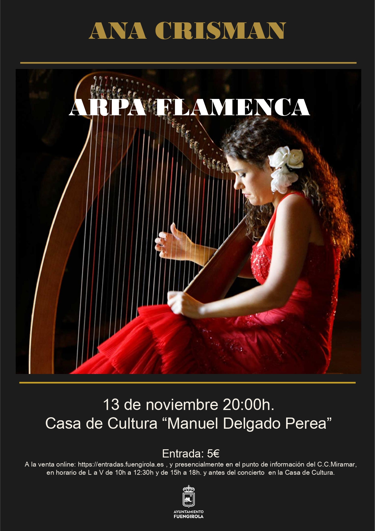 Arpa flamenca de Ana Crismán, la artista jerezana primera y única arpista flamenca a nivel mundial. Dominio del compás y unas manos muy habilidosas que plasman en este dificilísimo y bello instrumento el flamenco más puro, dando lugar a una belleza muy sofisticada.