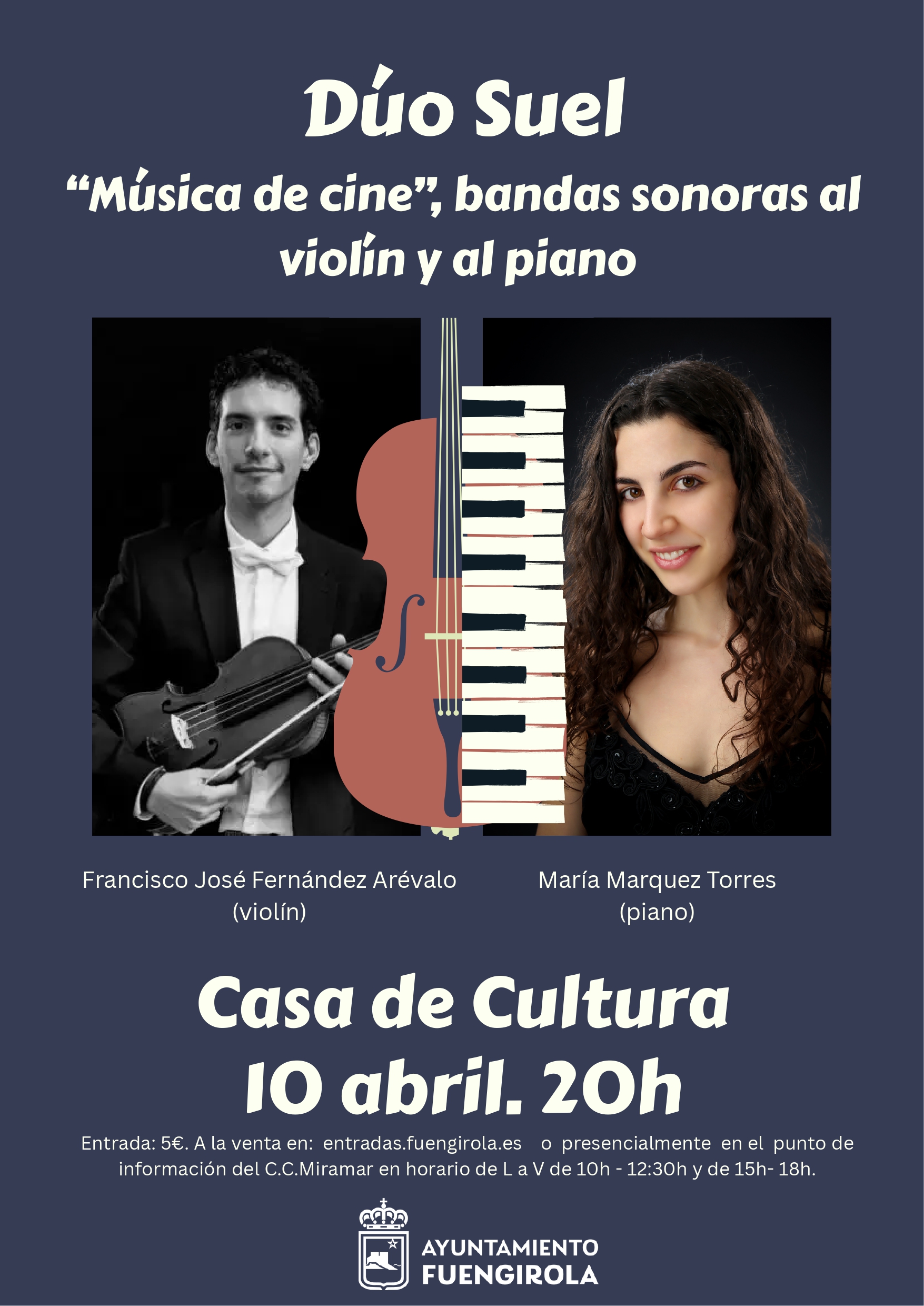 Entrada: 5€ . A la venta en: entradas.fuengirola.es  o  presencialmente en el  punto de información del C.C.Miramar en horario de lunes a viernes de 10:00h – 12:30h y de 15:00h 18:00h.
