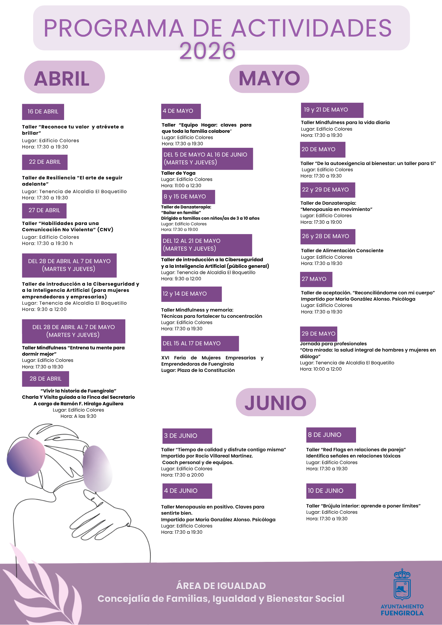 El Ayuntamiento de Fuengirola, a través del Área de Igualdad, pone en marcha la programación de actividades correspondientes al segundo trimestre de 2026, que se desarrollará durante los meses de abril, mayo y junio. Esta iniciativa municipal continúa apostando por la promoción del bienestar, la igualdad de oportunidades y el desarrollo personal, ofreciendo espacios de encuentro, aprendizaje y crecimiento para toda la ciudadanía.