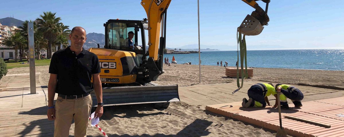 Fuengirola, ciudad accesible y sus playas, también. Es su objetivo: convertirse en un destino libre de barreras. Por eso desde el equipo de gobierno se ha puesto en marcha una nueva inciativa para que todas sus playas, las cuatro, cuenten con áreas adaptadas para personas con movilidad reducida. De modo que esta semana han comenzado los trabajos colocación de tres plataformas, las cuales estarán asistidas además por personal de salvamento. Éstas se unen a la playa adaptada de Las Gaviotas con las que cuenta el municipio desde el 2000. Así lo ha anunciado en rueda de prensa el concejal responsable, José Sánchez, quien se ha desplazado hasta la zona centro para comprobar cómo iban estos trabajos.
