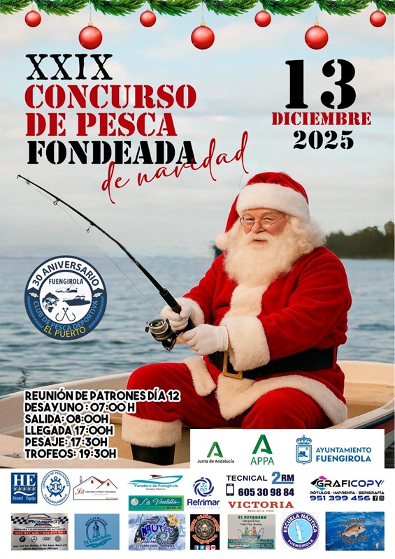 9/12/2025 – Fuengirola celebrará este sábado 13 de diciembre el XXIX concurso de pesca desde embarcación fondeada ‘Trofeo de Navidad’, que un año más organiza la Sociedad de Pesca Deportiva El Puerto. El concejal de Deportes del Ayuntamiento de Fuengirola, Julio Rodríguez, acompañado por Pedro Núñez, presidente de la citada asociación de pesca, han presentado la nueva edición de este evento deportivo. Las inscripciones tienen un precio de 20 euros y se pueden realizar en la sede de la asociación hasta la reunión de patrones que se celebrará el viernes 12 de diciembre.