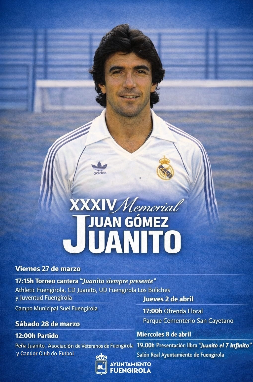 Como acto de clausura, el miércoles 8 de abril, a las 19:00 horas, el Salón Real del Ayuntamiento de Fuengirola será escenario de la presentación del libro ‘Juanito, el 7 infinito’, obra del periodista Salva Martín junto a Roberto Gómez, hijo del futbolista.