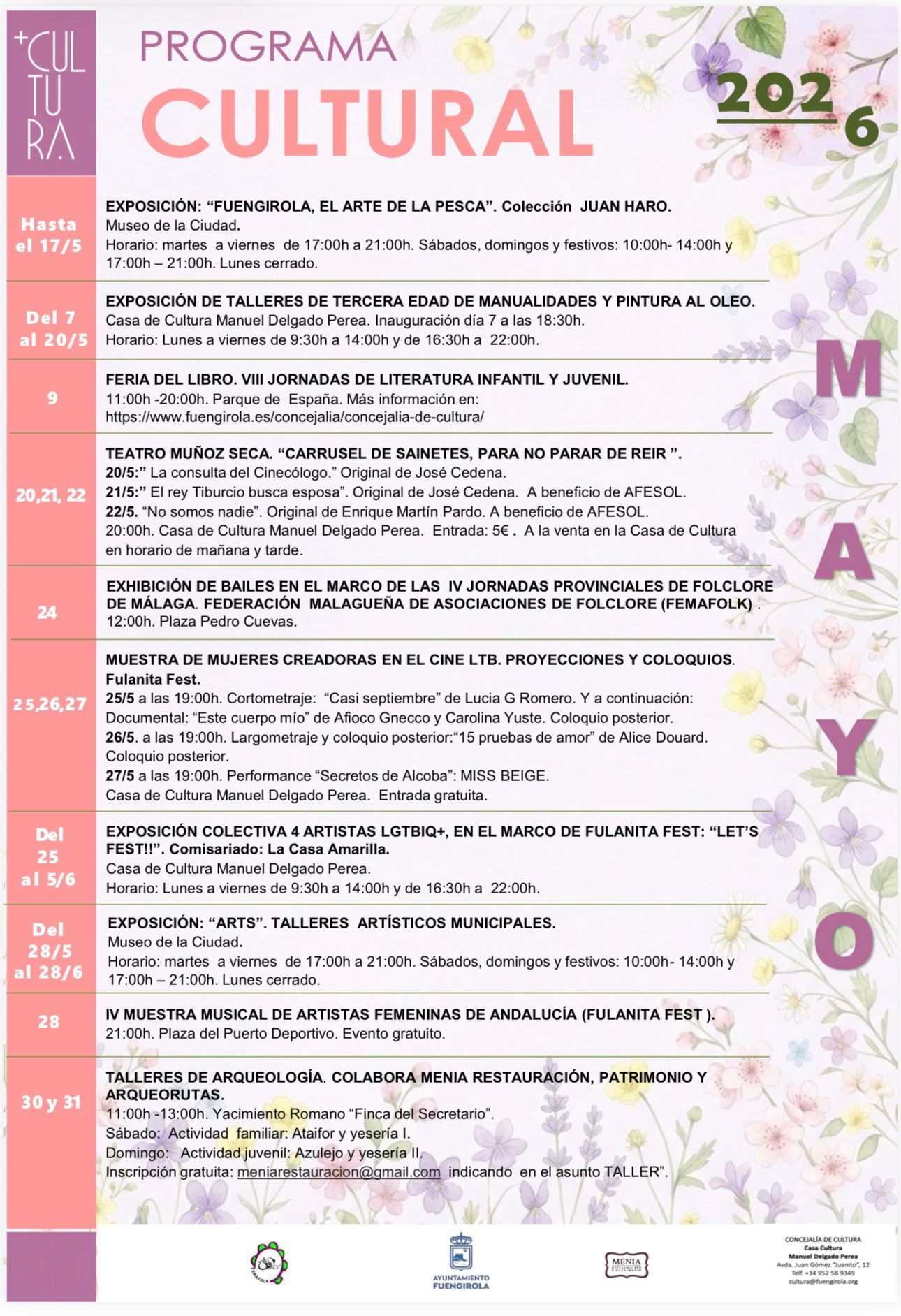 30/4/2026 – El concejal de Cultura del Ayuntamiento de Fuengirola, Rodrigo Romero, ha presentado esta mañana la programación cultural diseñada para el mes de mayo, una agenda amplia y variada que incluye exposiciones, teatro, literatura, talleres de arqueología, cine, música y folclore, con actividades dirigidas a todos los públicos.