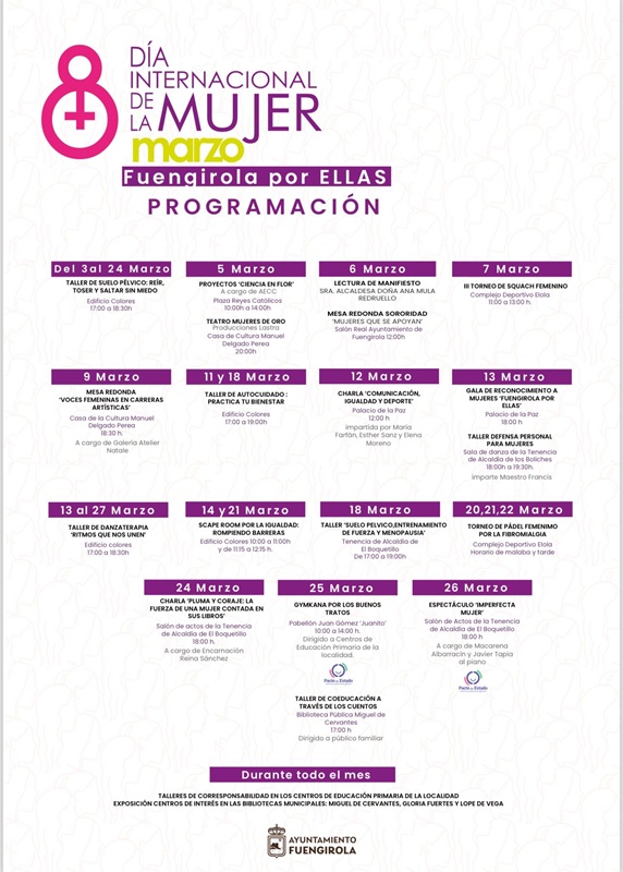 2/3/2026 – La Concejalía de Deportes del Ayuntamiento de Fuengirola, que dirige el edil Julio Rodríguez, ha organizado un total de siete actividades que formarán parte de la programación municipal ‘Fuengirola por ellas’, diseñada con motivo del Día Internacional de la Mujer, que se conmemora el 8 de marzo.